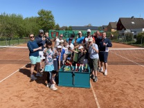 Für alle Mitglieder, unabhängig von Alter und Spielstärke, hat ein Doppel-Schleifchenturnier stattgefunden. In zwei Runden wurden jeweils ein Kind und ein Erwachsener zu einem Team zusammengelost, so dass im Modus „jeder gegen jeden“ antrat, um die größte Anzahl an Schleifchen zu erringen. Für jeden Sieg gab es eine weitere Schleife an den Schläger gebunden. Am Ende schafften es mehrere Teams mit der gleichen Anzahl an Schleifchen auf das Podium – doch Gewinner waren natürlich alle Spieler, die mit viel Enthusiasmus und Spaß teilgenommen haben. Die jüngsten U6 Spieler hatten die Möglichkeit, sich die Schleifchen bei einem Low-T-Ball Turnier zu erspielen. Bei Grill- und Kuchenbuffet konnte zwischendurch neue Energie gesammelt werden.